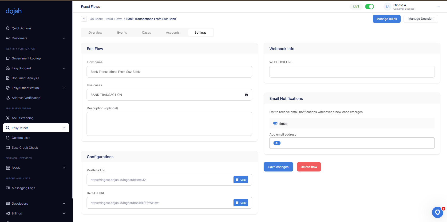 tab of your flow dashboard. Here you can adjust metadata, define how final decisions are made based on risk scores in