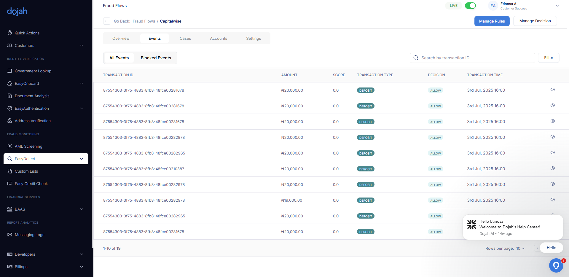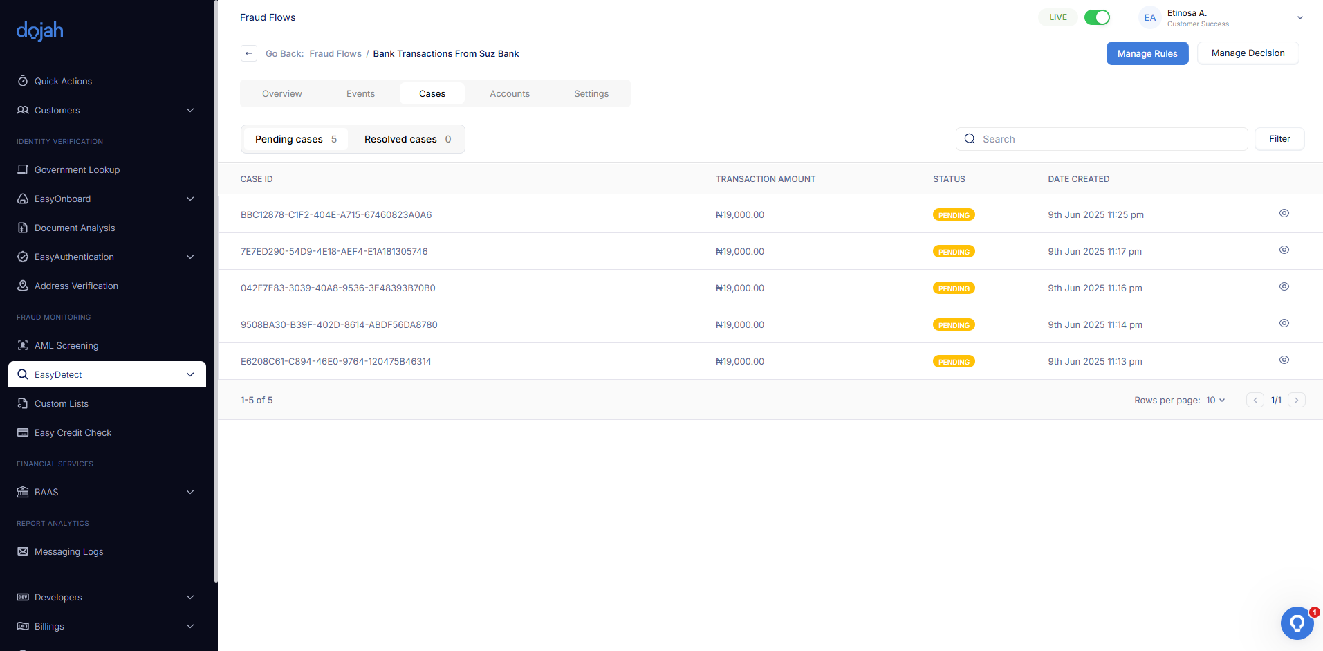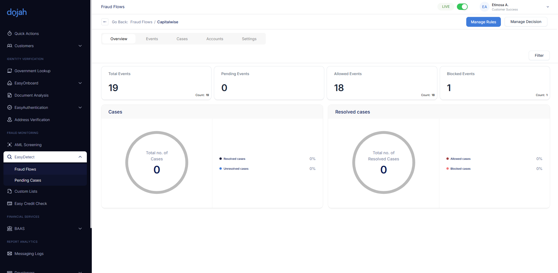 The Flow Dashboard gives you a complete picture of the activity passing through your rules. Use the tabs (Overview, Events, Cases, Accounts) to move between a high-level summary, detailed transaction lists, flagged cases needing review, and a directory of the accounts involved.