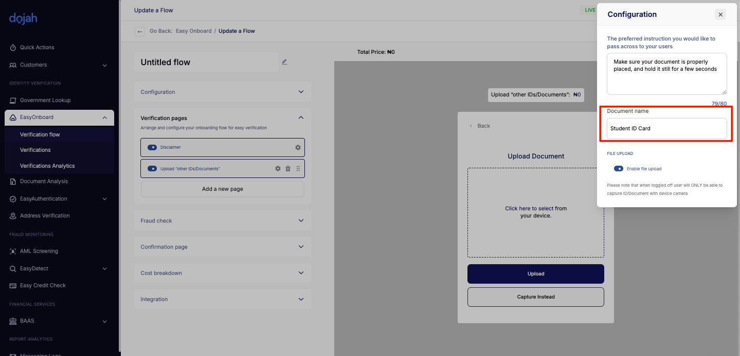 Configure page by naming the document that can be uploaded