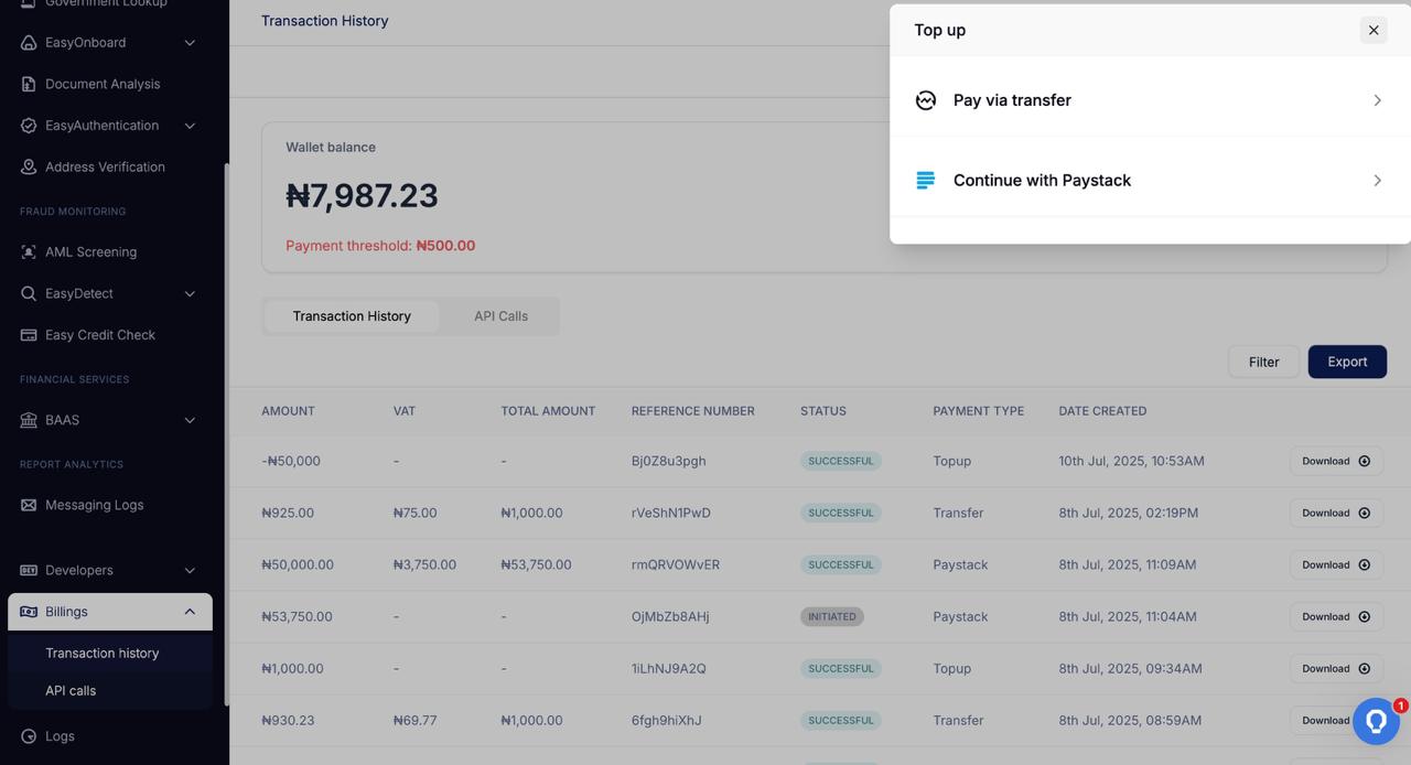 Add funds to your Dojah wallet via transfer or Paystack. Check balance on the dashboard or via API so your verifications never stop.