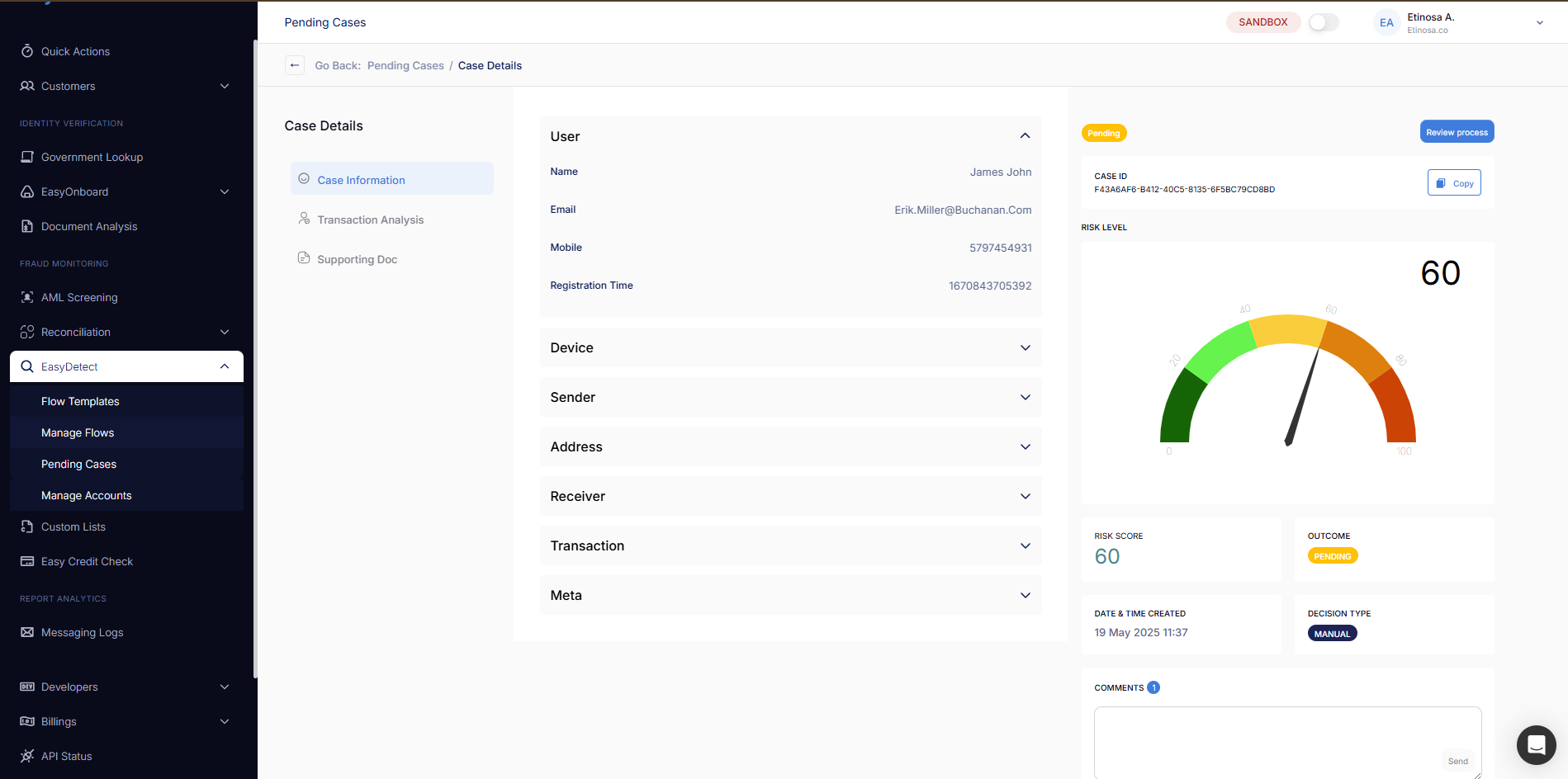 Once a user completes a verification flow, their result is logged and accessible in the Verifications section of the EasyOnboard dashboard. Every case is tagged with a status, metadata, and supporting evidence (documents, selfies, match scores, fraud signals). Based on your flow configuration, verifications may be auto-approved, auto-declined, or marked for manual review.